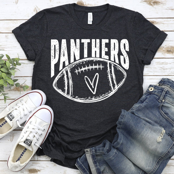 Show your Panther pride with this cute design, one of our favorites. The little heart in this design can be left in the football or moved to the sleeve and your favorite player's number can be added. This shirt is shown on dark heather gray but would look great on black or red.